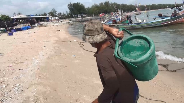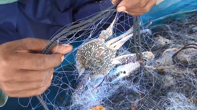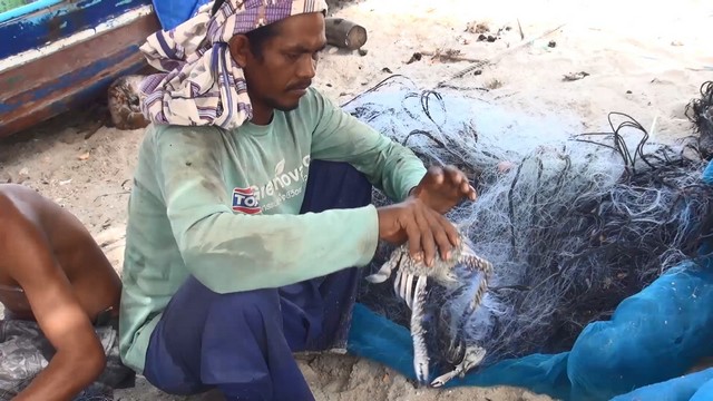 นายเส็น หมานหมัด ชาวประมงอวนปู อายุ 50 ปี อยู่ในชุมชนบ้านเก้าเส้ง อ.เมือง จ.สงขลา กล่าวว่า วันนี้ได้นำเรือออกไปวางอวนปูม้า ตั้งแต่ประมาณตีสาม โดยวิ่งเรือออกไปประมาณเกือบชั่วโมงจากฝั่งบ้านเก้าเส้ง ระยะทางประมาณ 7 – 8 กิโลเมตร เพื่อไปเก็บอวนปูที่วางทิ้งไว้เมื่อ 3 วันที่ผ่านมา และนำอวนปูชุดใหม่ไปวางทิ้งไว้แทนอวนเก่า และนำอวนปูเก่ากลับเข้าฝั่ง วันนี้ได้ปูม้าประมาณ 6 – 7 กิโลกรัม ทั้งตัวใหญ่และตัวเล็ก ทั้งตัวผู้ตัวเมีย โดยนำอวนกลับเข้าฝั่งและนำขึ้นมาแกะปูม้าออกจากอวนบริเวณชายหาด ไม่เหมือนการแกะกุ้งและปลา เนื่องจากแกะปูออกจากอวนยากกว่า อีกทั้งเมื่อแกะออกมาแล้วก็จะต้องนำไปใส่ถุงตาข่ายไปแช่น้ำในทะเล เพื่อไม่ให้ปูตาย เพราะปูม้าจะต้องขายปูเป็นๆ จึงจะได้ราคาดี