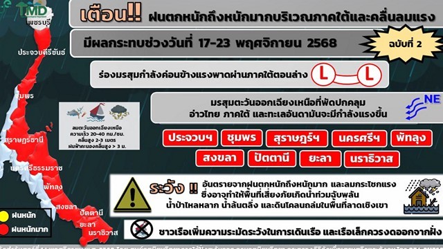 ร่องมรสุมจะพาดผ่านบริเวณภาคใต้ประกอบกับมรสุมตะวันออกเฉียงเหนือที่พัดปกคลุมอ่าวไทย ภาคใต้และทะเลอันดามันจะมีกำลังแรงขึ้น ลักษณะเช่นนี้ทำให้ภาคใต้ฝั่งตะวันออกมีฝนตกหนักหลายพื้นที่และมี ฝนหนักมากบางแห่ง ดังนี้ ช่วงวันที่ 17-19 พฤศจิกายน 2568 บริเวณจังหวัดประจวบคีรีขันธ์ ชุมพร สุราษฎร์ธานี และนครศรีธรรมราช