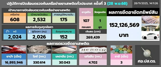 ทั้งนี้ ระหว่างวันที่ 15 – 28 พฤศจิกายน 2568 ได้ปิดล้อมตรวจค้นเป้าหมายยาเสพติดรวมทั้งสิ้น 5,173 จุด 1,261 เครือข่ายยาเสพติด จับกุมผู้ต้องหา 7,667 ราย ตรวจยึดยาเสพติด แบ่งเป็น ยาบ้า 43,724,077 เม็ด, ไอซ์ 2,089.512 กิโลกรัม, เคตามีน 37.045 กิโลกรัม, เฮโรอีน 13.640 กิโลกรัม, ยาอี 199 เม็ด พร้อมทั้งตรวจยึดอาวุธปืน 203 กระบอก, วัตถุระเบิด 1 ลูก, เงินสด 1,157,800 บาท ผลการอายัดทรัพย์สินรวม 270,955,620 บาท