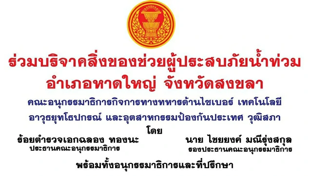 วันศุกร์ที่ 28 พฤศจิกายน 2568 พลเอก สวัสดิ์ ทัศนา ประธานคณะกรรมาธิการการทหารและความมั่นคงของรัฐ วุฒิสภา ได้มอบหมาย สว. สมบูรณ์ หนูนวลรองประธานกรรมาธิการคนที่1และโฆษกคณะกรรมาธิการ พร้อมคณะอนุกรรมาธิการกิจการทหารด้านความมั่นคงแบบองค์รวม เป็นผู้แทนมอบสิ่งของช่วยเหลือผู้ประสบอุทกภัยน้ำท่วมในพื้นที่จังหวัดชายแดนภาคใต้