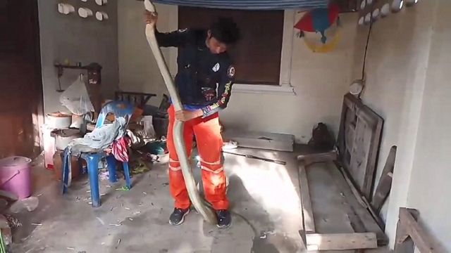 หลังนายทวีศักดิ์ ฯ ได้รับแจ้ง จึงรีบนำอุปกรณ์ในการจับงูเข้าตรวจสอบที่บ้านเลขที่ดังกล่าวทันที เมื่อไปถึงบ้านของนางขิ้ม ฯเจ้าหน้าที่ก็ตรงไปยังตาชั่งน้ำหนักที่วางอยู่ในบ้าน เมื่อเจ้าหน้าที่เข้าสำรวจก็พบว่าเป็นงูจงอางตัวใหญ่สีทอง จึงเข้าทำการจับ โดยเจ้าหน้าที่เข้าทำการจับตรงส่วนหางงูแล้วลากออกมาจากใต้ตาชั่ง อย่างช้าๆ จนสามารถจับส่วนหัวของงูจงอางไว้ได้ นำมาวัดได้ความยาว 3.80 เมตร รีบนำใส่กระสอบ เตรียมนำไปปล่อยคืนสู่ป่าธรรมชาติที่อยู่ห่างไกลบ้านเรือนผู้คนต่อไป