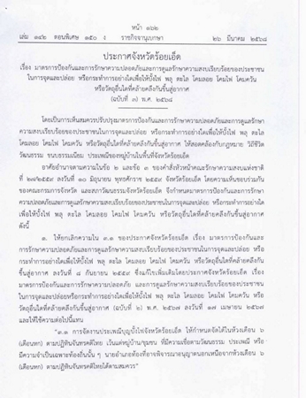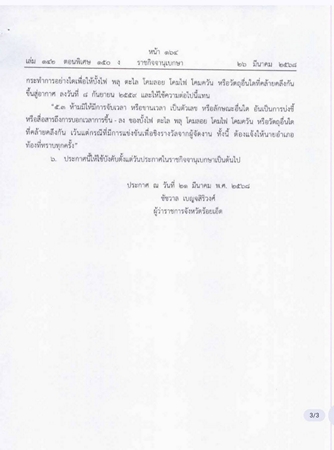 โดยเป็นประกาศจังหวัดร้อยเอ็ด เรื่อง มาตรการป้องกันและการรักษาความปลอดภัยและการดูแลรักษาความสงบเรียบร้อยของประชาชน ในการจุดและปล่อย หรือกระทําการอย่างใดเพื่อให้บั้งไฟ พลุ ตะไล โคมลอย โคมไฟ โคมควัน หรือวัตถุอื่นใดที่คล้ายคลึงกันขึ้นสู่อากาศ (ฉบับที่ 3) พ.ศ. 2568 ที่เผยแพร่ผ่าน ราชกิจจานุเบกษา เมื่อ 26 มี.ค. 2568