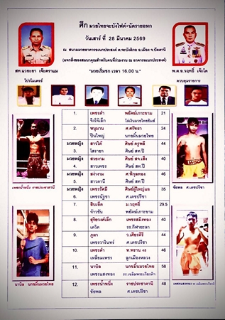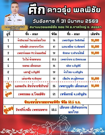” ร.ต.ท.เอนก เอกพันธ์ ” (.ดาบเนก ตากใบ ) ขอเชิญชมรายการมวยดี นัดพิเศษชิงแชมป์มวยรอบ รุ่นพิกัด 50.5 กิโลกรัม พร้อมคู่มวยถล่มเงินเดิมพันชิงทุนการศึกษา กับศึก “ดาวรุ่ง พลพิชัย ” ณ.สนามมวยพลพิชัย ซอย 14 อำเภอหาดใหญ่ จังหวัดสงขลา ในวันอังคารที่ 31 มีนาคม 2569 นี้