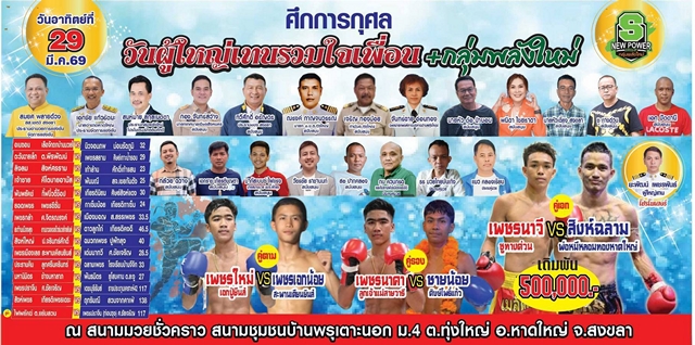 ” อ.กระจ่าง ศิริกาศ ” ฝากข่าวรายการมวยดี นัดพิเศษเพื่อการกุศล มากับศึก ” วันผู้ใหญ่เทน รวมใจเพื่อน + กลุ่มพลังใหม่ ” ณ.สนามมวยชั่วคราวสนามชุมชนบ้านพรุเตาะนอก หมู่ 4 ตำบลทุ่งใหญ่ อำเภอหาดใหญ่ จังหวัดสงขลา ในวันอาทิตย์ที่ 29 มีนาคม 2569.นี้