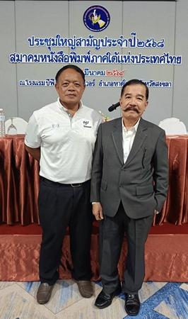 ” นายไชยยงค์ มณีรุ่งสกุล ” สมาชิกวุฒิสภา ( สว.) กลุ่มสื่อสารมวลชน /นายกสมาคมนักหนังสือพิมพ์ภูมิภาคแห่งประเทศไทย ให้เกียรติร่วมถ่ายภาพกับ ” สิงห์จุก มอ.” ผู้สื่อข่าวไทยนิวส์ คอลัมน์ แวด วงกีฬามวยไทยภาคใต้ ในวันประชุมใหญ่สามัญประจำปี 2568 ของสมาคมหนังสือพิมพ์ภาคใต้แห่งประเทศไทย ณ.โรงแรม บีพี แกรนด์ ทาวเวอร์ อำเภอหาดใหญ่ จังหวัดสงขลา เมื่อวันที่ 5 มีนาคม 2569 ที่ผ่านมา