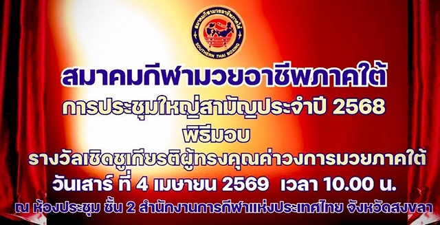 ผอ.พิทยา รัตนพันธ์ นายกสมาคมกีฬามวยอาชีพภาคใต้ ขอเชิญคณะกรรมการของสมาคมฯ และบุคคลในวงการมวยภาคใต้ เข้าร่วมประชุมสามัญประจำปี 2568 ในวันเสาร์ที่ 4 เมษายน 2569 นี้ ณ.ห้องประชุมชั้น 2 สำนักงานการกีฬาแห่งประเทศไทยจังหวัดสงขลา สนามติณสูลานนท์ อำเภอเมือง จังหวัดสงขลา ตั้งแต่เวลา 10:00 น เป็นต้นไป